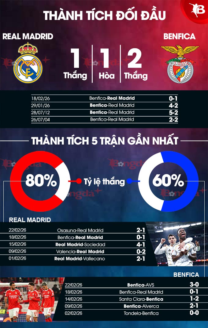 - Lẻ bàn thắng: 4/5 trận đấu gần đây của Real Madrid kết thúc với tổng số bàn thắng là số lẻ. Tình trạng tương tự xảy ra ở 4 trận vừa qua của Benfica.