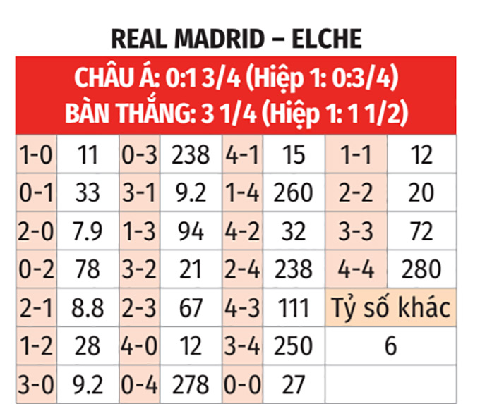 - Không quá 3 bàn: 3/4 trận gần đây của Elche chỉ có tối đa 3 bàn. Cả 6 trận vừa qua của Real số lần lưới rung cũng đều dưới 4.