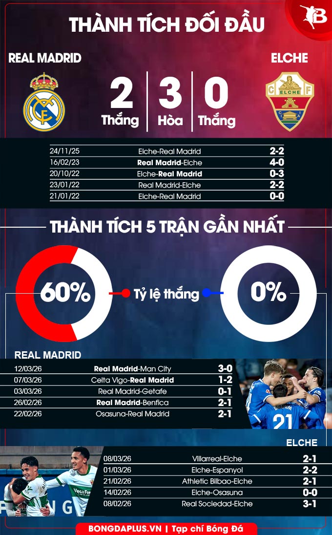 Điểm tựa hiếm hoi của Elche trước chuyến hành quân tới Madrid có lẽ nằm ở yếu tố thể lực, bởi Real Madrid vừa trải qua trận đấu căng thẳng với Man City. Tuy nhiên, chừng đó khó có thể bù đắp sự chênh lệch về đẳng cấp. Nếu thi đấu đúng sức, Los Blancos hoàn toàn đủ khả năng giành chiến thắng cách biệt.