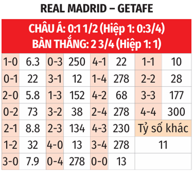 - Lẻ bàn thắng: 6/10 trận đối đầu gần nhất giữa Real Madrid vs Getafe có tổng bàn thắng không chia hết cho 2. Điều tương tự xảy ra ở 6/10 trận vừa qua của Real Madrid trên mọi đấu trường