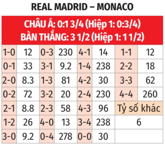 - Tối đa 3 bàn thắng cả trận: 4/5 trận sân nhà gần nhất của Real Madrid chỉ có nhiều nhất 3 bàn thắng. Tình trạng tương tự xảy ra ở 4/6 trận đấu Cúp gần đây của Monaco.