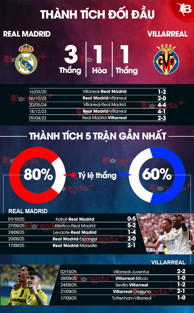 Phong độ của Villarreal không thua kém Real Madrid là bao nhiêu. Trong khi Real thắng 4/5 trận gần nhất thì Villarreal thắng 3/5 trận vừa xong. Chưa hết, Real Madrid có lợi thế sân nhà và đang có thành tích ấn tượng tại Santiago Bernabeu khi toàn thắng 8 trận gần nhất trên mọi đấu trường.