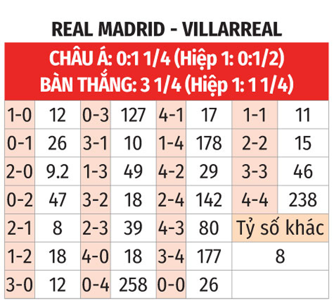 - Lẻ bàn thắng: 5/7 trận đối đầu gần nhất giữa 2 CLB có tổng bàn thắng không chia hết cho 2. Ngoài ra, 8/10 trận vừa qua của Real Madrid và 4/5 trận mới đây của Villarreal chứng kiến điều tương tự.