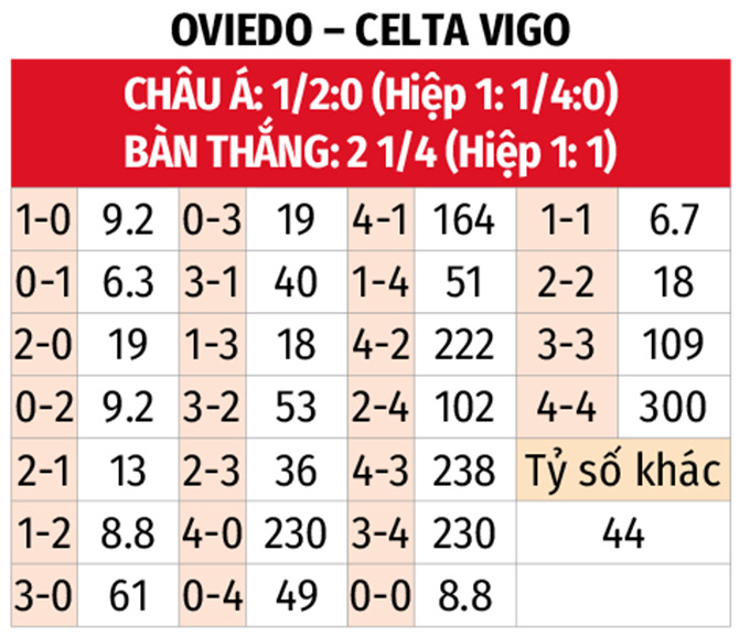 - Tối đa 1 bàn hiệp 1: Các chân sút Real Oviedo tịt ngòi 6 trận liên tiếp gần đây trong hiệp thi đấu đầu tiên. Với Celta Vigo, 8 trận vừa qua của đội khách có tối đa 1 pha làm bàn trước giờ nghỉ, với 5 trận có tỷ số hòa 0-0.