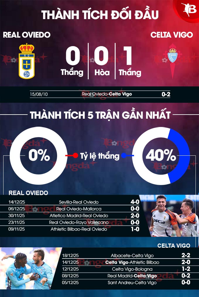 Trong khi đó, Celta Vigo hành quân đến Oviedo sau thất bại đáng xấu hổ trước Albacete tại cúp Nhà vua Tây Ban Nha cách đây vài ngày trên chấm 11m. Mặc dù vậy, Os Celestes đang có phong độ tốt ở La Liga, giành được 5 chiến thắng trong 7 trận đấu gần đây nhất, trong đó bại tướng có cả những đối thủ rất mạnh như Real Madrid và Bilbao.
