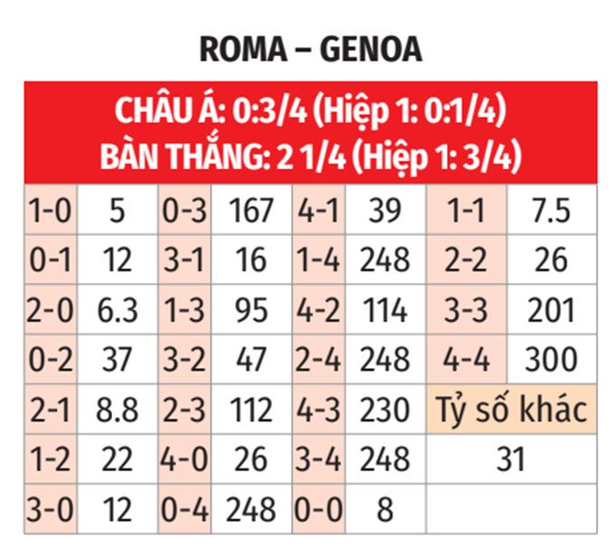 - Roma thua hiệp 1 theo châu Á: Trong 7 trận gặp Genoa gần đây, Roma thua hiệp 1 theo châu Á tới 6 lần. Ngoài ra, đội bóng này cũng mới thua hiệp 1 theo châu Á ở 4/5 trận gần nhất nên không phải là sự lựa chọn đáng tin trước giờ nghỉ.