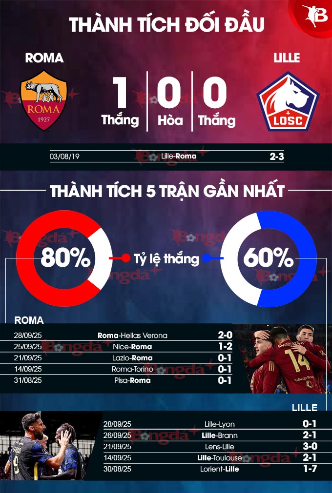 Phong độ của Roma vs Lille đang không có sự chênh lệch. Cụ thể, trong khi Roma thắng 4/5 trận gần nhất thì Lille thắng 3/5 trận vừa xong.