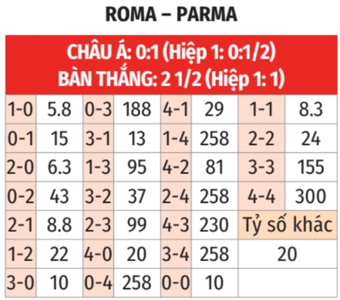 - Tối thiểu 1 bàn hiệp 1: 5 lần chạm trán giữa 2 đội gần đây đều có từ 1 bàn thắng trở lên trong hiệp 1. 6 trận đấu gần đây của Roma và 5/8 trận sân khách vừa qua của Parma tương tự.