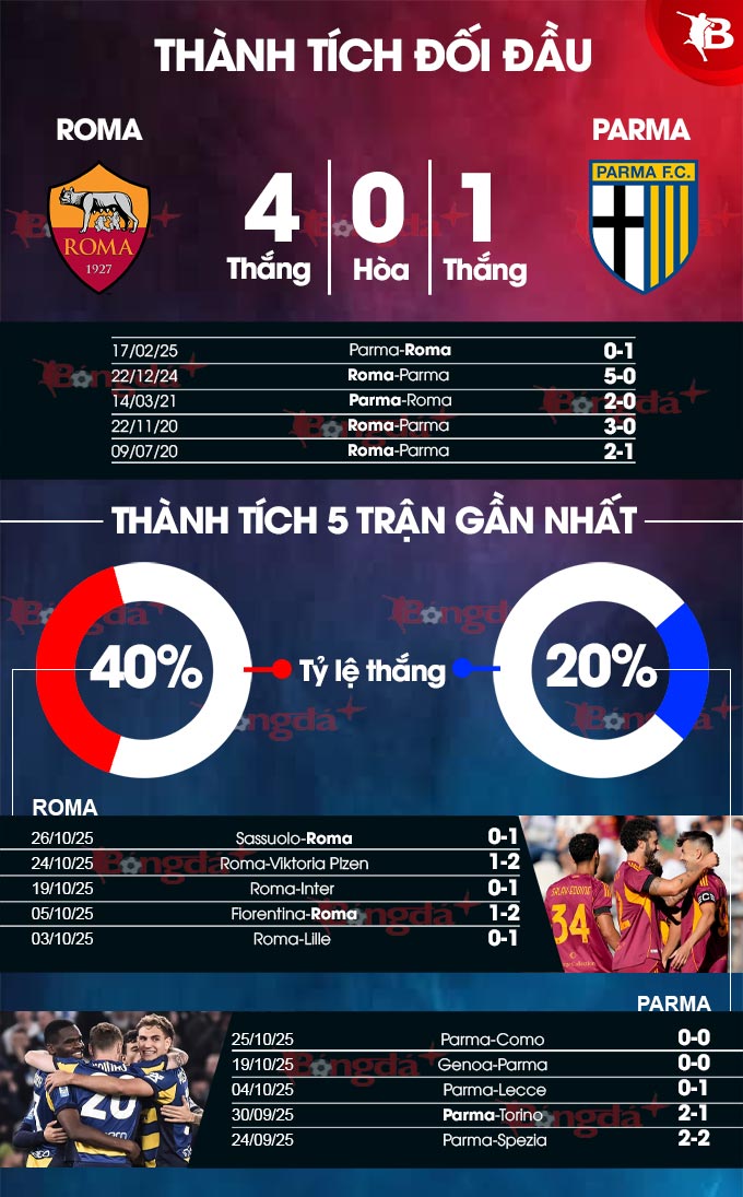 Tuy gần đây chơi không tốt trên sân nhà, nhưng Roma lại luôn áp đảo mỗi khi tiếp đón Parma tại sào huyệt Olimpico trong quá khứ. Bằng chứng là trong 18 lần tiếp đón đối thủ này, họ bất bại và giành tới 16 chiến thắng. Riêng ở lần gặp gần nhất tại Serie A mùa trước, đội bóng thành Rome vùi dập đội khách Parma 5 bàn không gỡ.