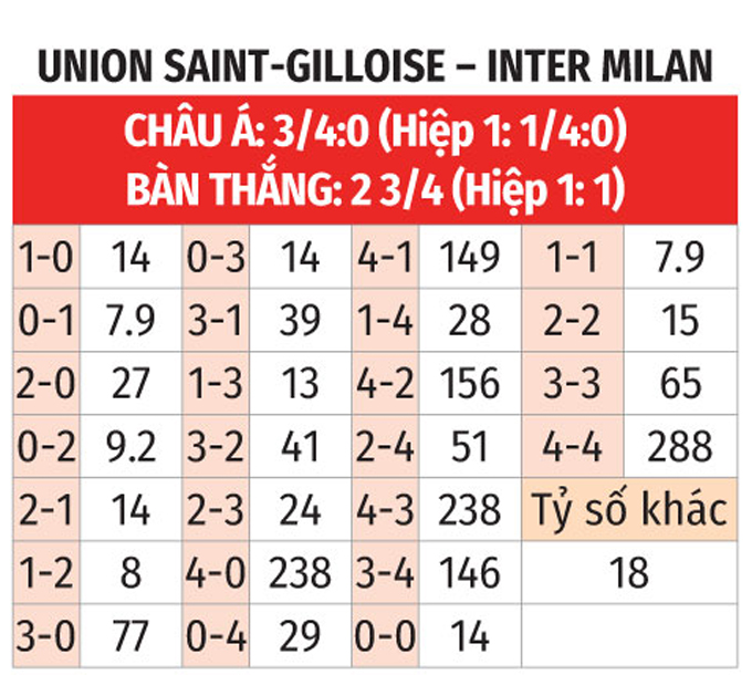 - Lẻ bàn thắng: 3/4 trận gần nhất của Royale Union SG có tổng bàn thắng không chia hết cho 2. Ngoài ra, 3/4 trận sân khách vừa qua của Inter chứng kiến điều tương tự.