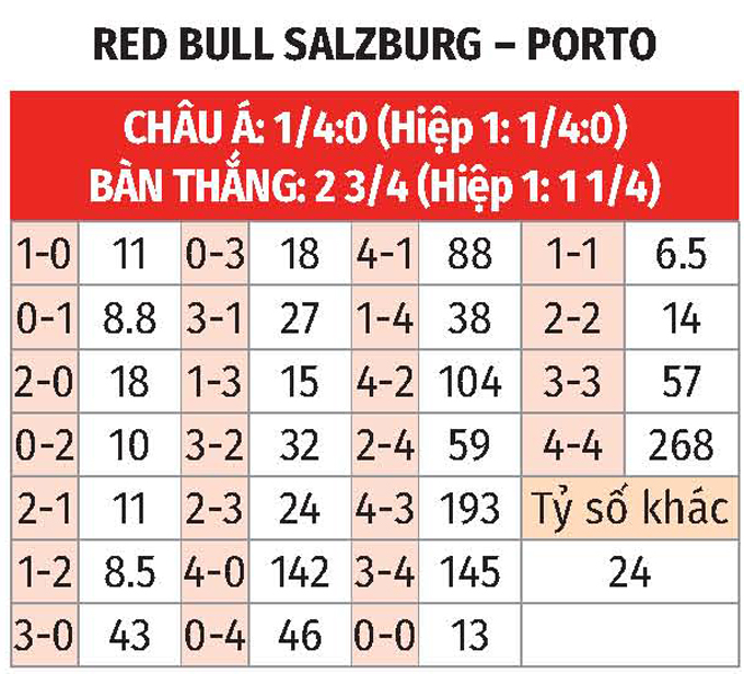 - Lẻ bàn thắng: 5/9 trận gần nhất của Salzburg có tổng bàn thắng không chia hết cho 2. Ngoài ra, 3 trận vừa qua Porto đều chứng kiến điều tương tự.