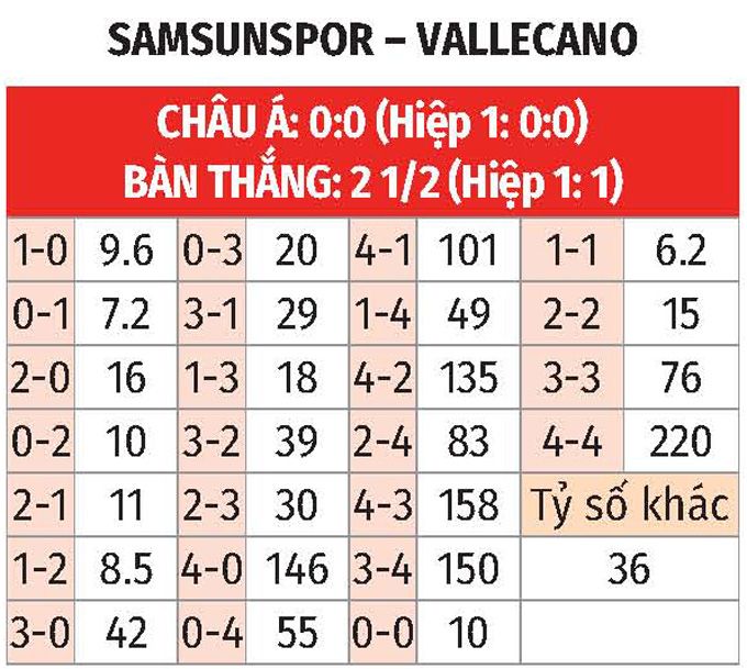 - Tỷ số chẵn: 4/5 trận gần đây của Samsunspor kết thúc với tỷ số chẵn. Đây cũng là điều xảy ra ở 5/7 trận vừa qua của Vallecano.