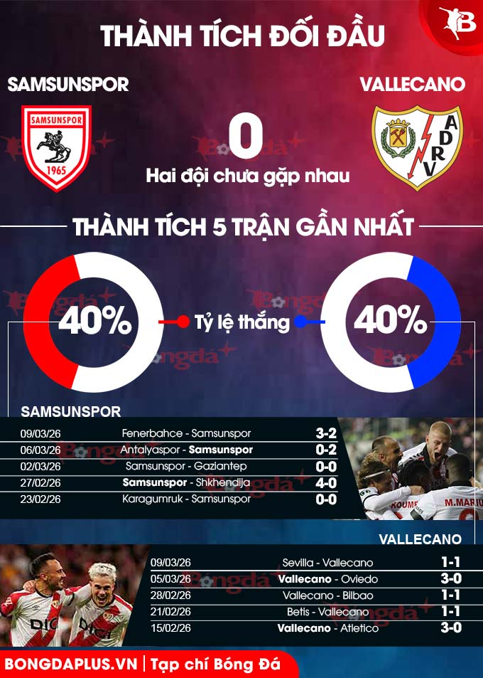Ngược lại, Samsunspor thắng 3, hòa 2 và thua 1 ở 6 trận vừa xong. Dẫu vậy, Vallecano với kinh nghiệm và đội hình tốt hơn vẫn có khả năng kiếm được 1 kết quả tốt để làm bàn đạp cho trận tái đấu.