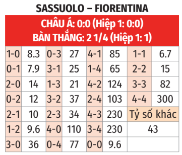 - 3 bàn trở lên: 5/6 trận chính thức gần đây của Fiorentina trên sân khách, 4/5 trận vừa qua của Sassuolo và 13/17 lần chạm trán gần nhất giữa đôi bên đều khép lại với tối thiểu 3 bàn thắng.