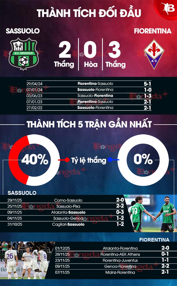 Trong bối cảnh ấy, việc gặp một Sassuolo đang có thành tích khá ổn định dưới tay HLV Fabio Grosso có vẻ là nhiệm vụ khó khăn cho Fio. Tuy nhiên, đội bóng áo tím lại rất có duyên trước Sassuolo khi thắng 3/4 lần chạm trán gần nhất, trong đó Fio ghi cả thảy 10 bàn tức trung bình lên tới 2,5 bàn/trận. 3 trận sân nhà gần đây, Sassuolo chỉ giành đúng 1 điểm trước Pisa sau khi lần lượt trắng tay trước Roma và Genoa.