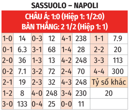 - Napoli thắng theo châu á: 3 trận chính thức gần đây Sassuolo đều không thắng theo châu á (hòa 1, thua 2) và đều diễn ra trên sân nhà. 8 trận sân khách vừa qua ở Serie A khi chấp 3/4 đến 1 trái, thành tích theo châu á của Napoli là thắng 5, hòa 1, thua 2. Napoli cũng thắng theo châu á cả 5 lần gần nhất chạm trán Sassuolo.