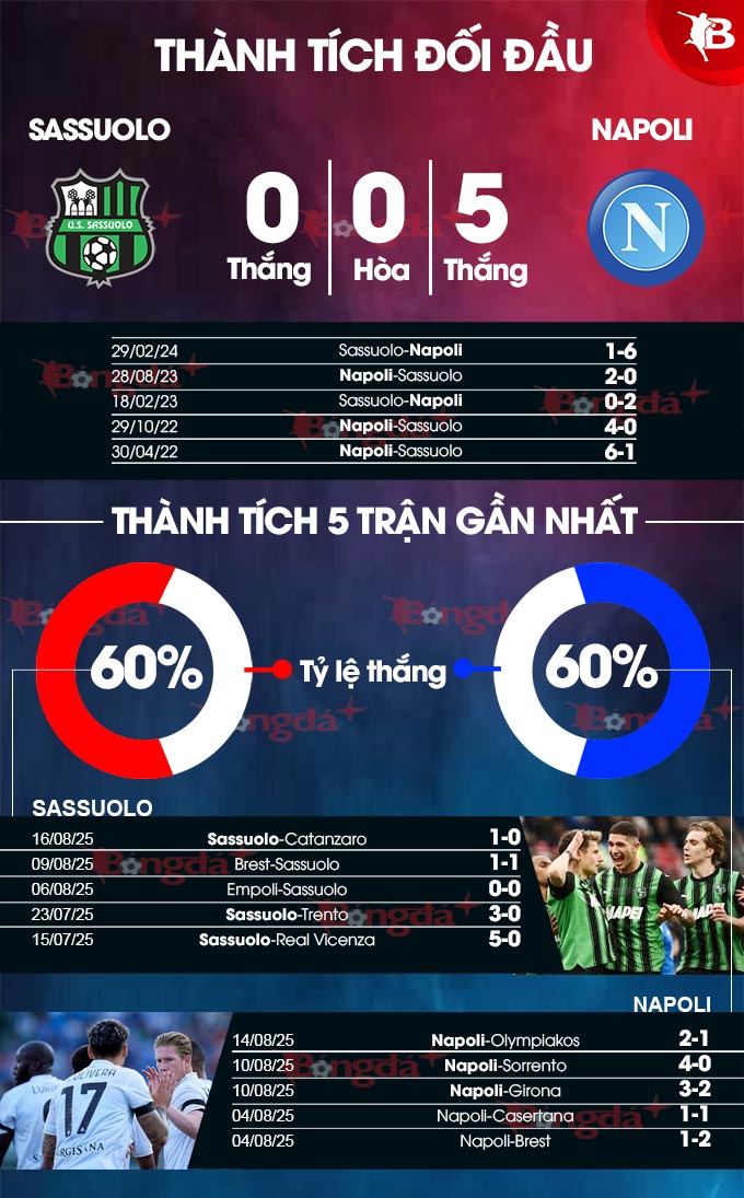Từ sau khi Sassuolo 0-2 trên sân nhà vào tháng 11/2020 dưới thời HLV Gennaro Gattuso, Napoli đã nã cả thảy 25 bàn vào lưới đối thủ này trong 6 lần chạm trán gần nhất, tức trung bình hơn 4 bàn/trận.