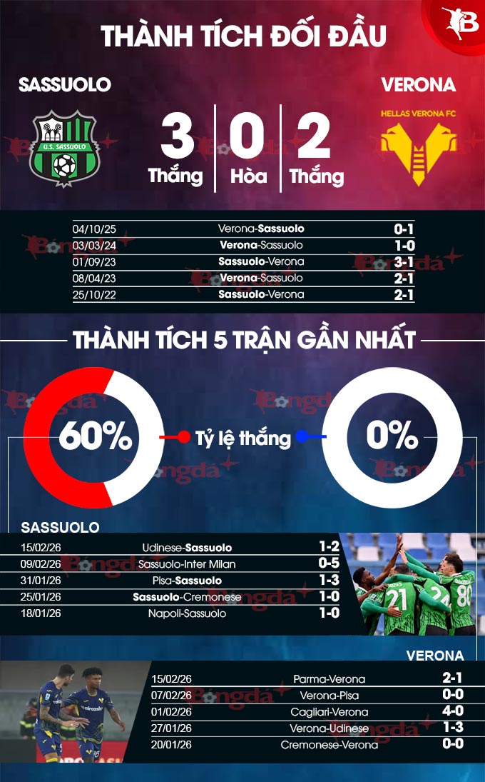 • Trên 2 bàn: 3/4 trận gần đây của Verona đều có trên 2 bàn. 3 trận gần nhất của Sassuolo cũng có tối thiểu 3 lần lưới rung.