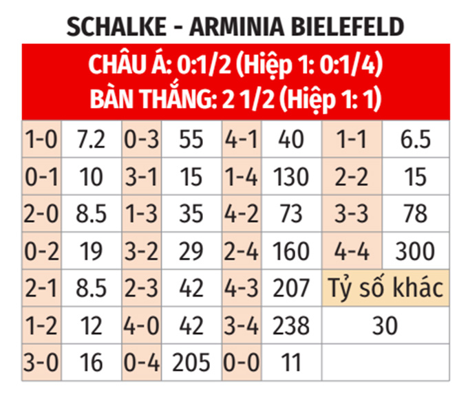 - Schalke thắng theo châu Á: Schalke thắng 10/13 trận đối đầu chính thức gần nhất với Arminia Bielefeld, thắng 6/8 trận sân nhà vừa qua.