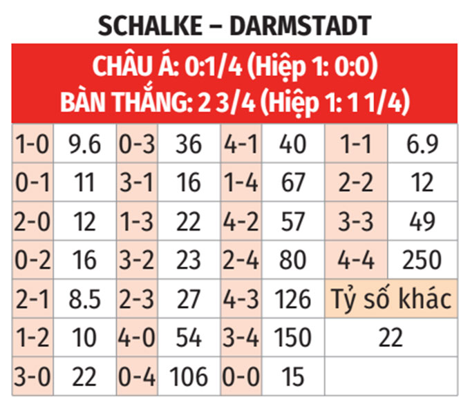 - Trên 10 phạt góc: Cả 4 trận vừa qua trên sân của Schalke đều có ít nhất 11 quả phạt góc. 7/8 trận gần đây giữa Schalke và Darmstadt cũng diễn ra theo kịch bản tương tự.