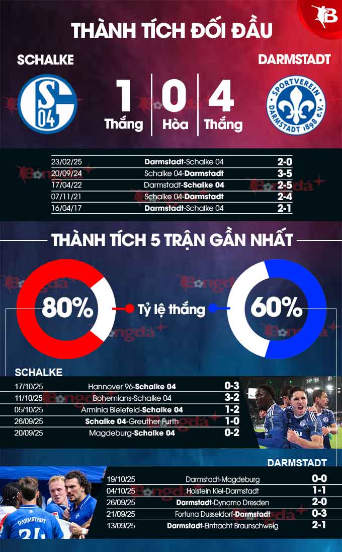 Cũng cần phải nói thêm rằng, trong 5 lần chạm trán Schalke gần đây, Darmstadt có đến 4 lần giành được phần thắng. Chi tiết trên chứng tỏ Darmstadt rõ ràng là "khắc tinh" của Schalke. Chính bởi vậy nên dù có lợi thế sân nhà cùng đà thắng như chẻ tre, cũng chẳng dễ để Schalke cắt được mạch bất bại của đội khách.