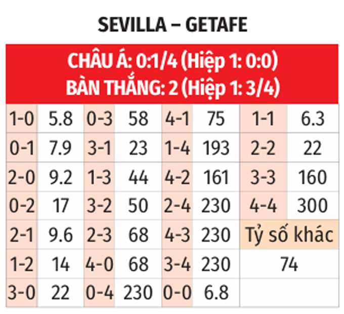 - Chẵn bàn thắng: 8/10 trận đối đầu vừa qua của Sevilla có tổng bàn thắng chia hết cho 2. Ngoài ra, 4/6 trận vừa qua của Getafe đều chứng kiến điều tương tự.