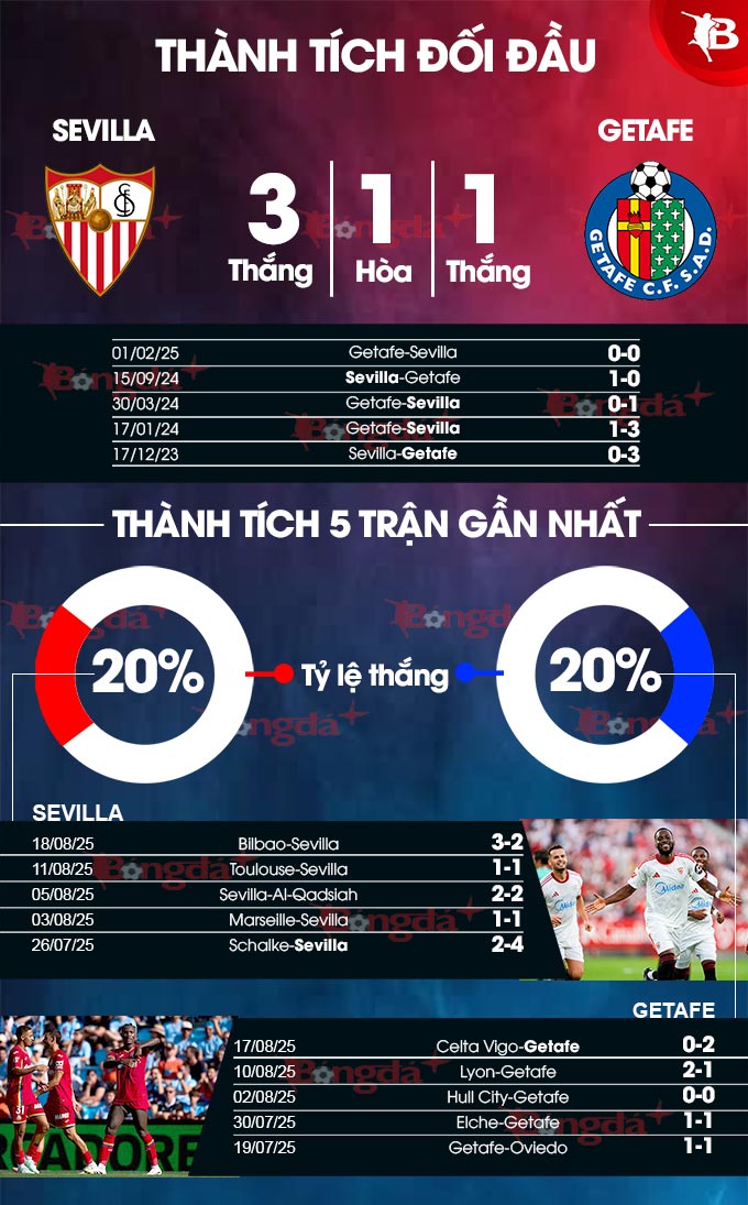 Ở ngày ra quân tại La Liga 2025/26, Sevilla chưa có điểm nào sau thất bại trước Bilbao và hiện xếp thứ 13. Trong khi đó, Getafe đang xếp thứ 5 khi có 3 điểm.