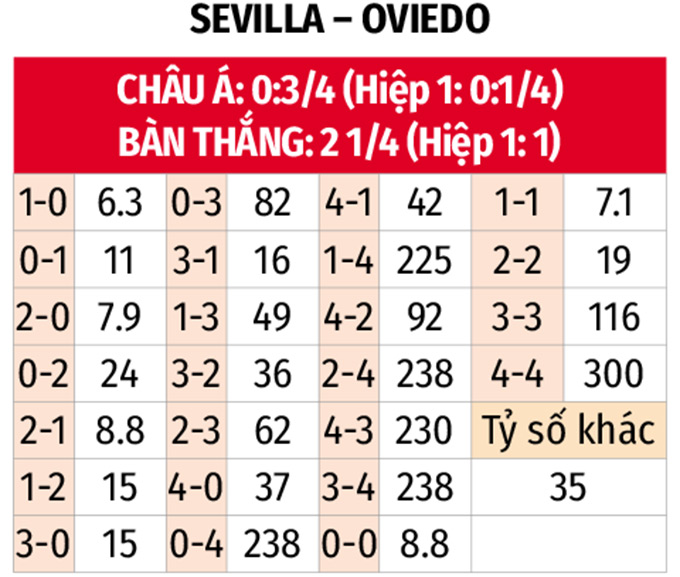 - Hiệp 1 không bàn thắng: Xu thế nhập cuộc chậm chạp được cả hai đội thể hiện. 5 trận liên tiếp của Sevilla tại La Liga có tỷ số 0-0 trước giờ nghỉ. Với Oviedo, 5 trận vừa qua của đội khách có 3 trận kết thúc hiệp đầu với tỷ số 0-0.