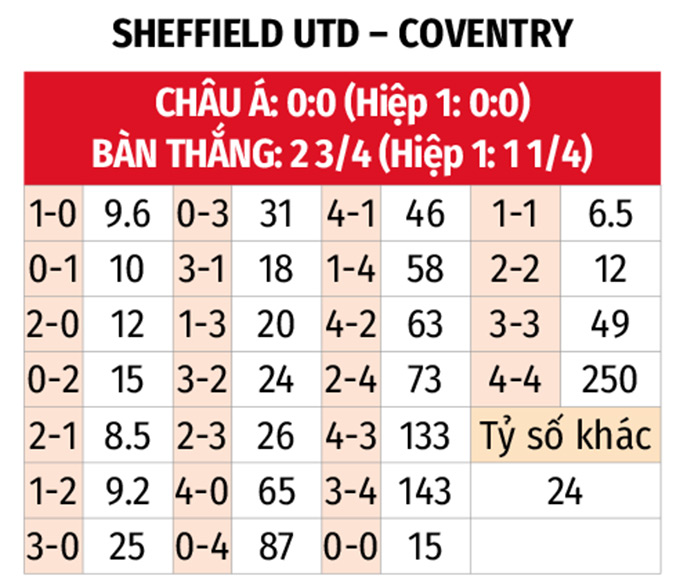 - Chẵn bàn thắng: 3/5 trận sân nhà gần đây của Sheffield United tại giải Hạng Nhất Anh cùng 3 trận liên tiếp vừa qua của Coventry đều kết thúc với tổng bàn thắng là chẵn. Kịch bản chẵn bàn thắng cũng diễn ra ở 4 trận đối đầu gần nhất.