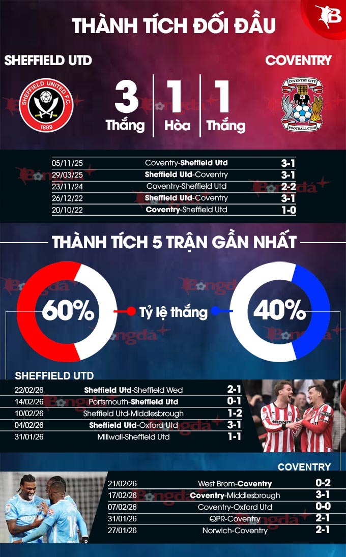 - Nhiều bàn thắng: 7 trận sân nhà liên tiếp của Sheffield United cùng 5/7 trận vừa qua của Coventry đều có từ 3 bàn thắng trở lên. 5/6 trận đối đầu gần nhất giữa hai đội thậm chí có tối thiểu 4 pha làm bàn.