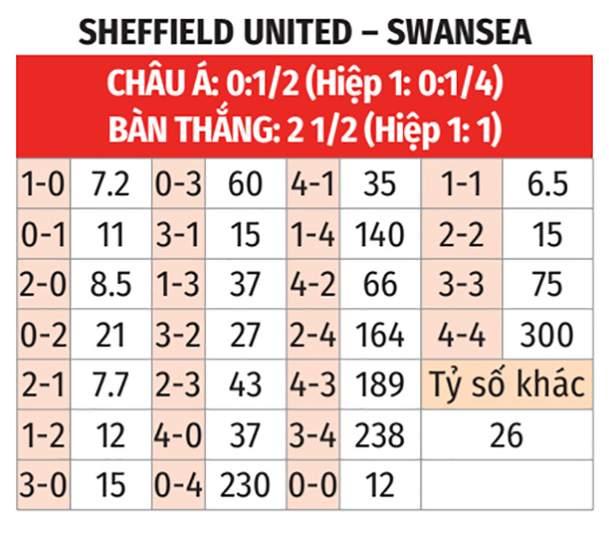 - Tỷ số lẻ: 4/5 trận sân nhà gần đây của Sheffield United kết thúc với tỷ số lẻ. 5 trận gần nhất giữa đội bóng này và Swansea City cũng có số bàn thắng không chia hết cho 2.
