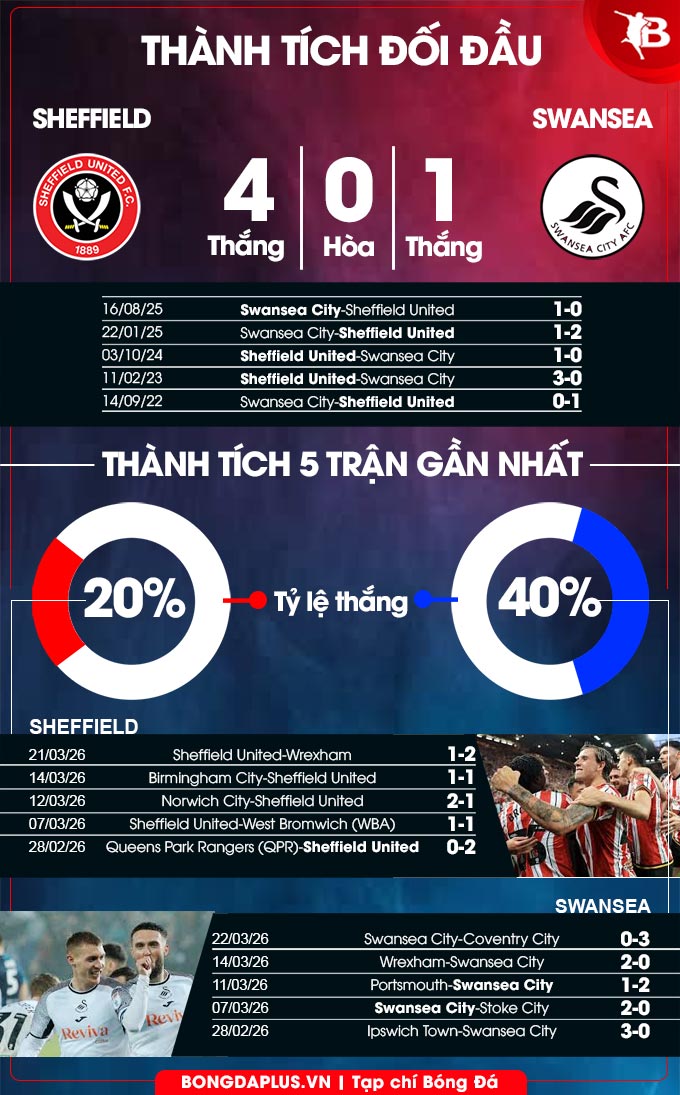 - Lưới rung cuối trận: 3/4 trận Sheffield United tiếp đón Swansea City gần đây đều có bàn thắng được ghi trong 12 phút cuối. Điều tương tự cũng diễn ra ở 3/4 trận gần nhất của Sheffield United.