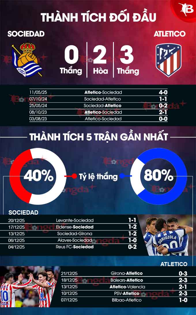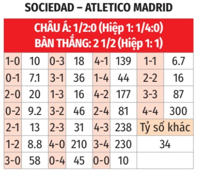 - Tối thiểu 3 bàn cả trận: Cả 4 trận đấu sân nhà gần đây của Sociedad đều có từ 3 bàn thắng trở lên. Tình trạng tương tự xảy ra ở 5/6 trận gần nhất của Atletico.