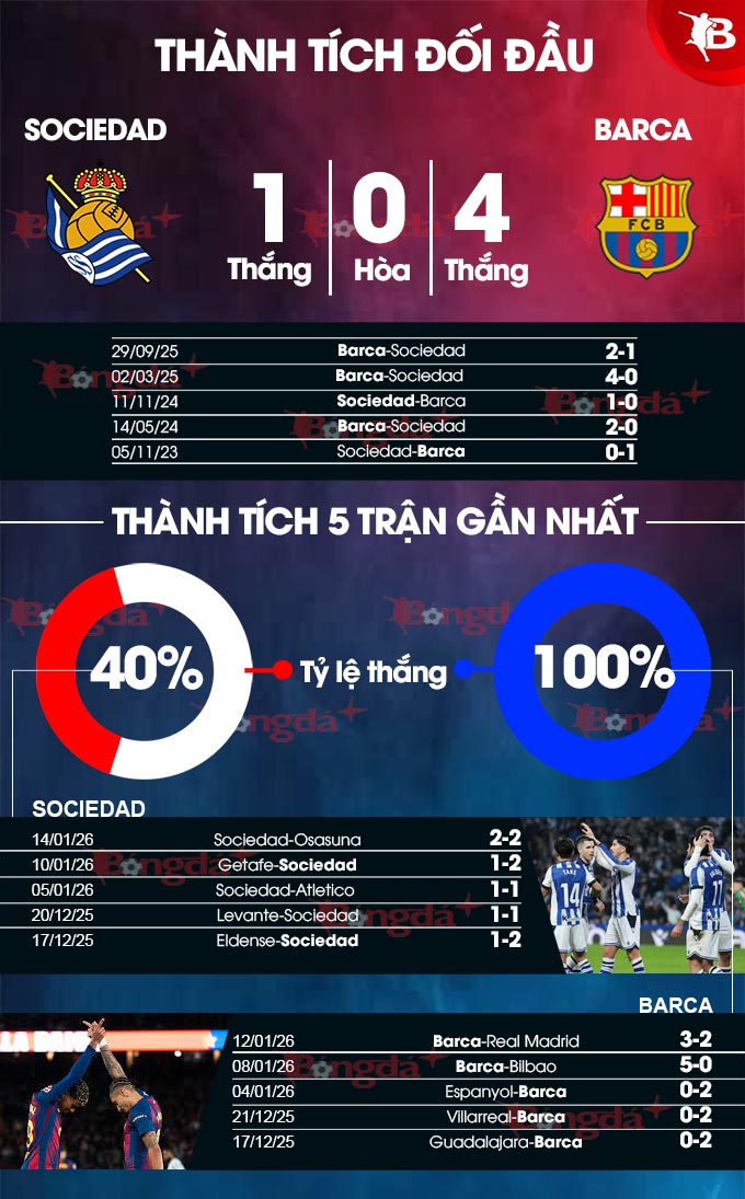 Barca càng không có lý do để ngán Sociedad nếu nhìn vào thống kê đối đầu giữa 2 đội trong quá khứ ở xứ Basque. Theo đó, trong 11 lần gần nhất đến thi đấu trên sân Reale, đội bóng xứ Catalunya áp đảo với 7 trận thắng, 3 trận hòa, chỉ phải nhận 1 thất bại. Sự ủng hộ của lịch sử chắc chắn sẽ tiếp thêm sức mạnh cho các học trò của ông Hansi Flick ở trận này.