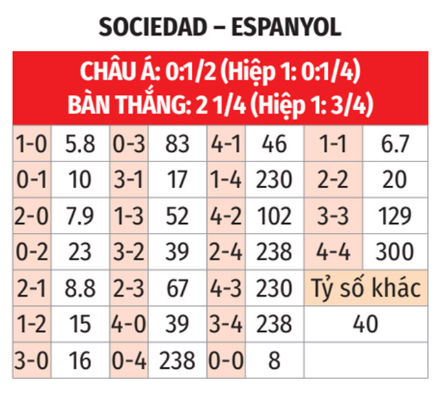 - Tỷ số chẵn: Cả 4 trận gần đây của Sociedad đều kết thúc với tỷ số chẵn. 4/6 trận sân khách vừa qua của Espanyol ở La Liga cũng có số bàn thắng chia hết được cho 2.