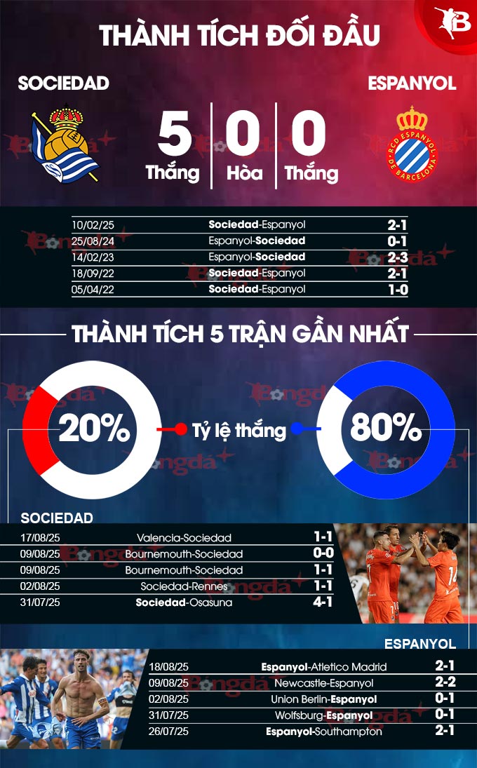 Trong 9 trận gặp Espanyol gần đây, Sociedad giành được tới 8 chiến thắng mà chỉ chịu thua có 1 trận.