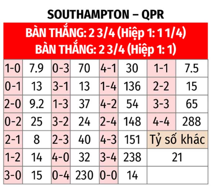 - Trên 2 bàn: 6/8 trận gần nhất giữa Southampton và QPR đều có trên 2 bàn. 4/5 trận gần đây của QPR số lần lưới rung cũng chạm ngưỡng 3.