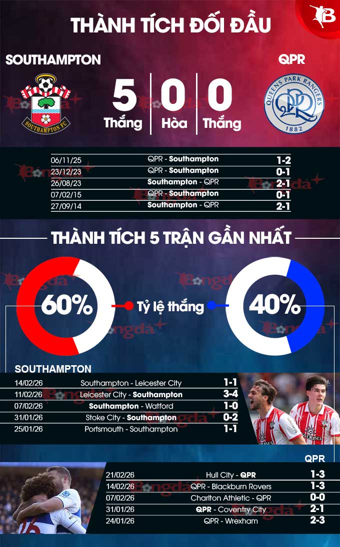 Với thành tích ấn tượng như vậy cộng thêm lợi thế sân nhà, nhiều khả năng Southampton sẽ đánh bại được QPR, đội đã toàn thua họ trong 5 cuộc đụng độ gần nhất giữa 2 bên.