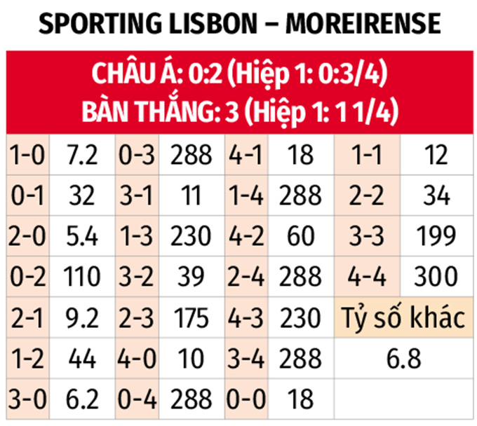 - Ít nhất 1 bàn hiệp 1: 5/6 trận gần đây của Sporting CP cùng 5/7 trận sân khách vừa qua của Moreirense đều có ít nhất 1 bàn thắng trong hiệp đầu. 4/5 trận đối đầu gần nhất thậm chí có từ 2 bàn trở lên trước giờ nghỉ.