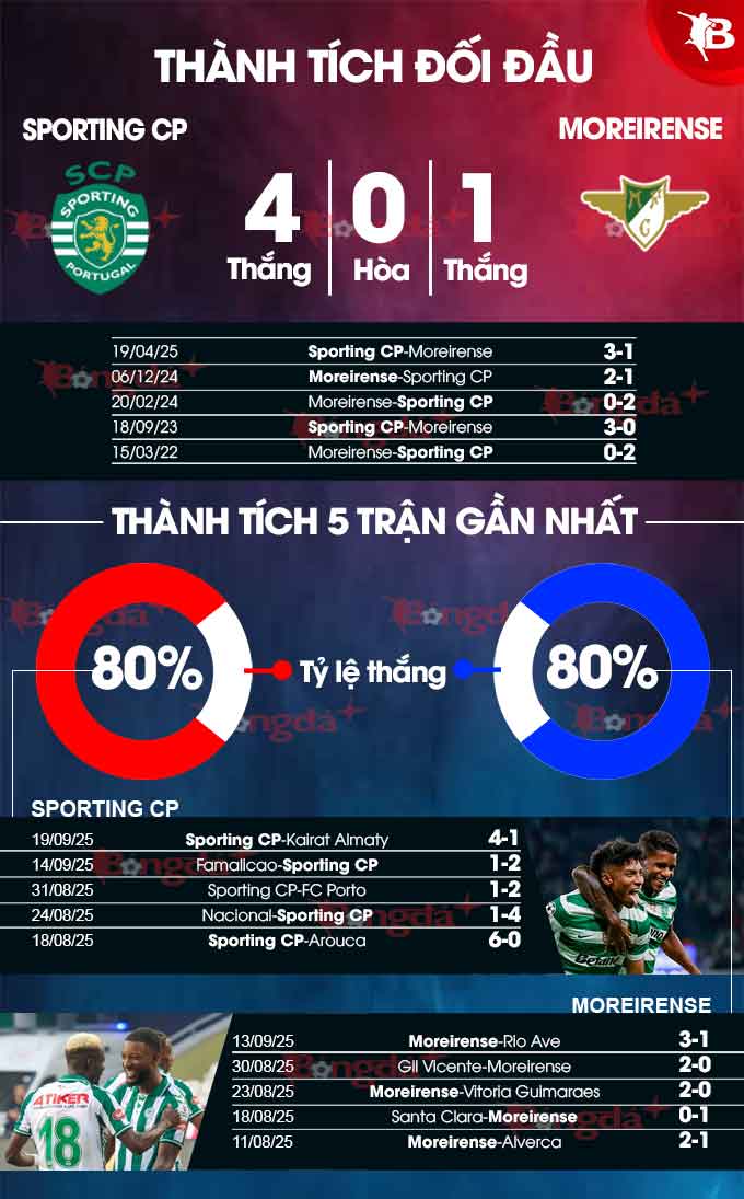 Mặc dù có phong độ rất tốt từ đầu mùa, nhưng Moreirenese thường gặp khó khăn trên sân khách. Đội bóng của HLV Da Costa đã thua 12 và chỉ thắng 5 trong 19 trận sân khách gần nhất tại giải đấu cao nhất Bồ Đào Nha. Chưa kể, Moreirense cũng thua 5/6 trận đối đầu Sporting CP gần nhất.