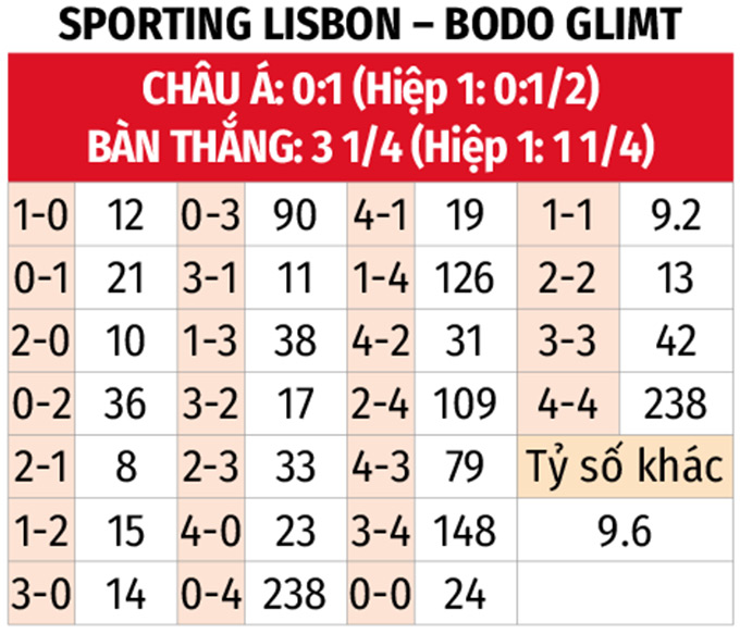 - Bodo Glimt thắng châu Á hiệp 1: Trận lượt đi chứng kiến Bodo Glimt thắng 2-0 ngay 45 phút đầu và đó là trận thứ 12 liên tiếp họ thắng châu Á trước giờ nghỉ. Với Sporting Lisbon, đội chủ nhà thua châu Á hiệp 1 ở 4/6 trận vừa qua.
