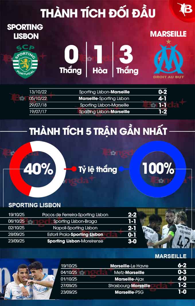 Tuy nhiên, 2 trong số 4 chiến thắng nói trên của Marseille lại là trước Sporting Lisbon. Mà cụ thể, ở 2 lần đụng độ nhau gần nhất ở vòng bảng Champions League 2022/23, OM đã thắng cả 2 trận, ghi 6 bàn và chỉ để thủng lưới 1 lần. Chiến thắng còn lại của Marseille trước Sporting Lisbon diễn ra trên đất Bồ Đào Nha ở trận giao hữu tiền mùa giải 2017/18.