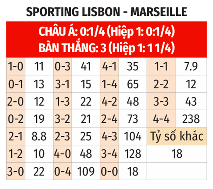 - Marseille thắng theo châu Á: Marseille thắng 3/4 cuộc đối đầu giữa hai đội, thắng cả 7 trận gần đây, thắng 3 chuyến làm khách vừa qua. Còn Sporting Lisbon thua cả 4 trận gần nhất. Do đó, những người yêu mến Marseille có thể tin tưởng vào họ ở trận này.