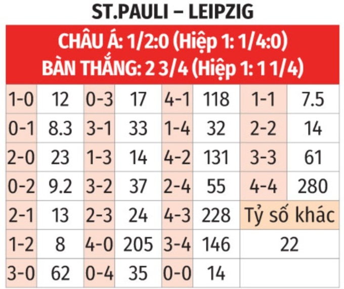 - Tối đa 2 bàn: 5/6 lần đối đầu giữa 2 đội gần đây đều kết thúc với tối đa 2 bàn thắng. Tình trạng tương tự xảy ra ở 3/4 trận sân nhà gần nhất của St.Pauli. Trong 4 trận sân khách gần đây của Leipzig, có 3 trận họ không ghi quá 1 bàn thắng.