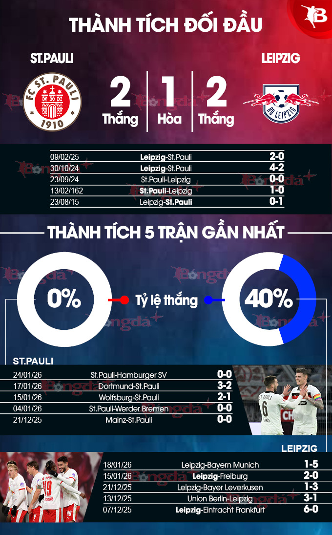 Leipzig hoàn toàn có thể coi chiến thắng trước Heidenheim là cú hích để trở lại với quỹ đạo chiến thắng. Chuyến hành quân ở trận đấu bù vòng 16 Bundesliga, về mặt lý thuyết đối với họ không quá khó khăn. St.Pauli chỉ là đội đang vật lộn trụ hạng. Cụ thể, đội chủ nhà mới giành được vỏn vẹn 3 chiến thắng sau 18 lượt trận và hiện đang xếp thứ 2 từ dưới lên tại Bundesliga, sau Heidenheim.