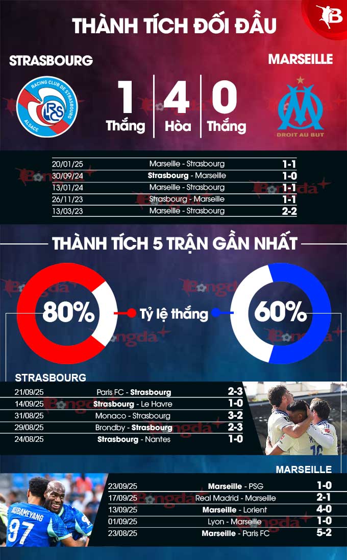 - Strasbourg thắng theo châu Á: Strasbourg thắng cả 6 cuộc đối đầu gần nhất, thắng cả 3 lần đón tiếp Marseille gần đây trên sân nhà. Ngoài ra, họ cũng thắng 8/9 trận gần đây. Còn Marseille thua 6/9 chuyến làm khách vừa qua. Vì thế, giới mộ điệu có thể tin ở Strasbourg trận này.