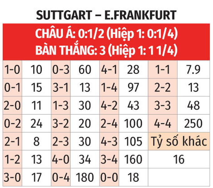 - Lẻ bàn thắng: 5 trận so T liên tiếp gần nhất giữa 2 CLB có tổng bàn thắng không chia hết cho 2. Ngoài ra, 7/10 trận sân nhà vừa qua của Stuttgart có tổng bàn thắng lẻ. Chưa hết, 7/10 lần Stuttgart tiếp Frankfurt trên sân nhà MHPArena cũng chứng kiến điều tương tự.
