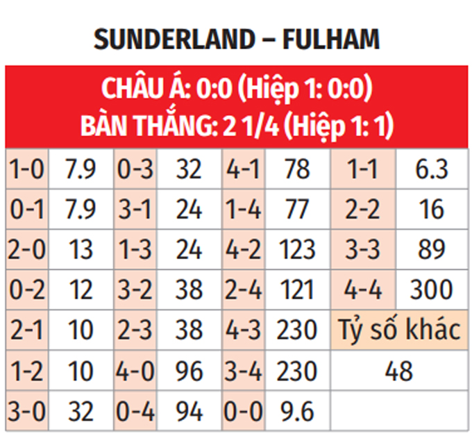 Phong độ của Sunderland vs Fulham không mấy khác biệt vào lúc này. Tuy nhiên, Fulham lại có thành tích đối đầu tốt hơn Sunderland. Do đó, nhiều khả năng, 3 điểm sẽ về tay đội khách Fulham.