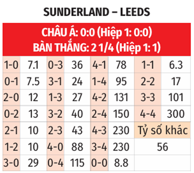 - Chẵn bàn thắng: 4/6 trận đối đầu trước đó giữa Sunderland vs Leeds có tổng bàn thắng chia hết cho 2. Ngoài ra, 4/6 trận vừa xong của Sunderland lẫn 3/4 trận mới đây của Leeds đều chứng kiến điều tương tự.