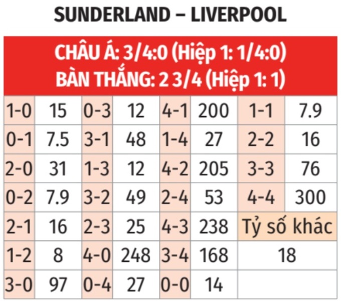 - Lẻ bàn thắng: 3/4 trận đấu gần đây của Sunderland kết thúc với tổng số bàn thắng là số lẻ. Tình trạng tương tự xảy ra ở 4/5 trận gần nhất của Liverpool.